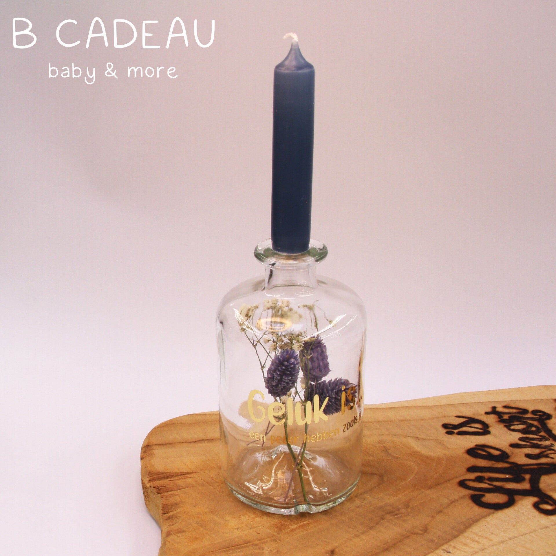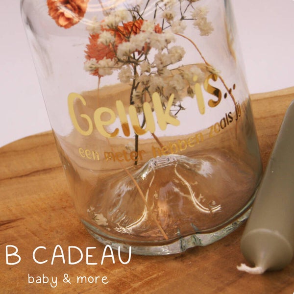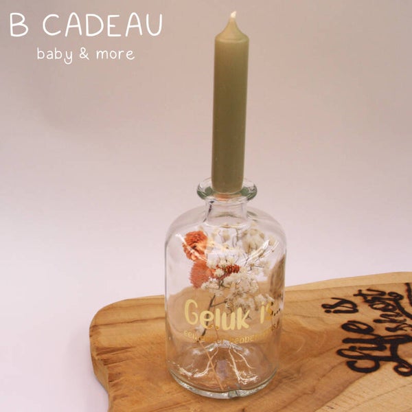 Kies jouw kleur van kaarjes en wij stoppen de best passende droogbloemen in het vaasje.Graag een opdruk? Hou het tekstje dan kort zoals de voobeelden.