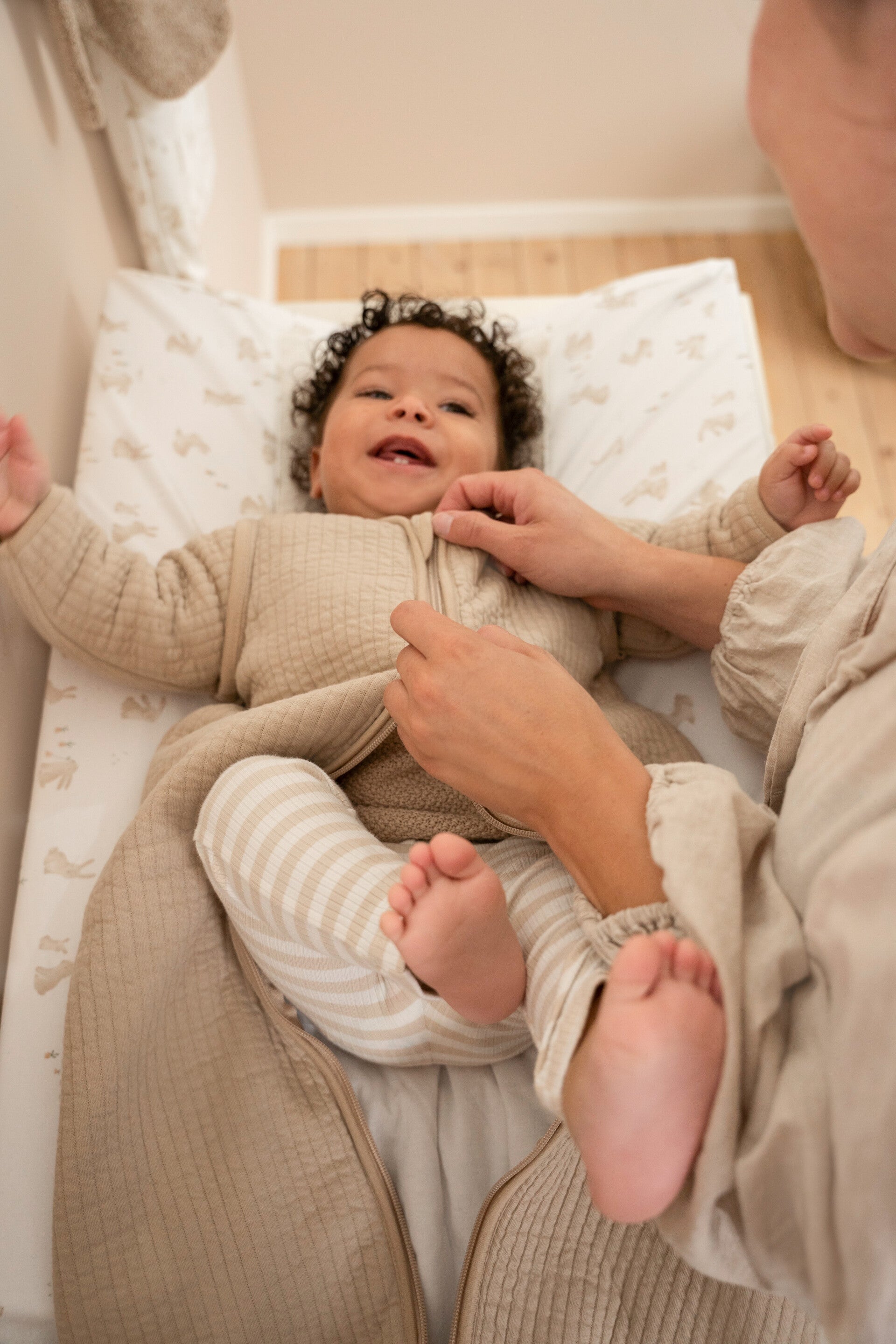 De Little Dutch winterslaapzakken met afritsbare mouwtjes zijn ideaal tijdens de koude winterdagen. Een winterslaapzak zorgt ervoor dat jouw kindje comfortabel en veilig kan slapen. Met een slaapzak kan je kindje zich namelijk minder makkelijk omrollen van de rug naar de buik, moeilijker uit bed klimmen en zich niet bloot woelen. De winterslaapzak beschikt over een ritssluiting aan de voorkant, die van beneden naar boven open gaat. Zo kan je kindje de slaapzak niet zelf uitdoen. De buitenstof van slaapzak Pure Beige is gemaakt van katoen en polyester en de voering is gemaakt van 100% polyester.