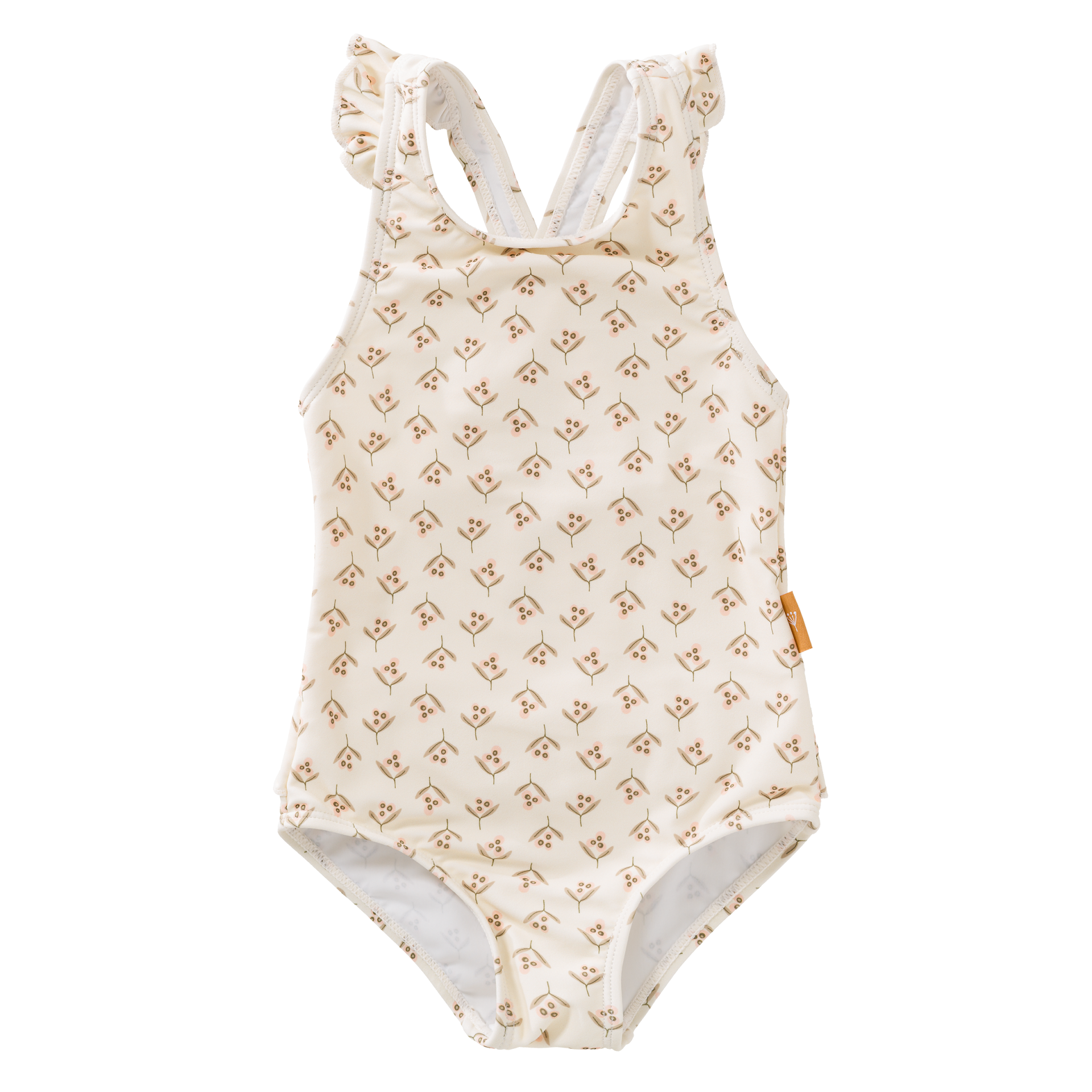 Dit kinder badkostuum met rushes heeft een kruis op de rug zodat de bandjes niet afzakken en is gemaakt uit UV-werende stof met factor 50.