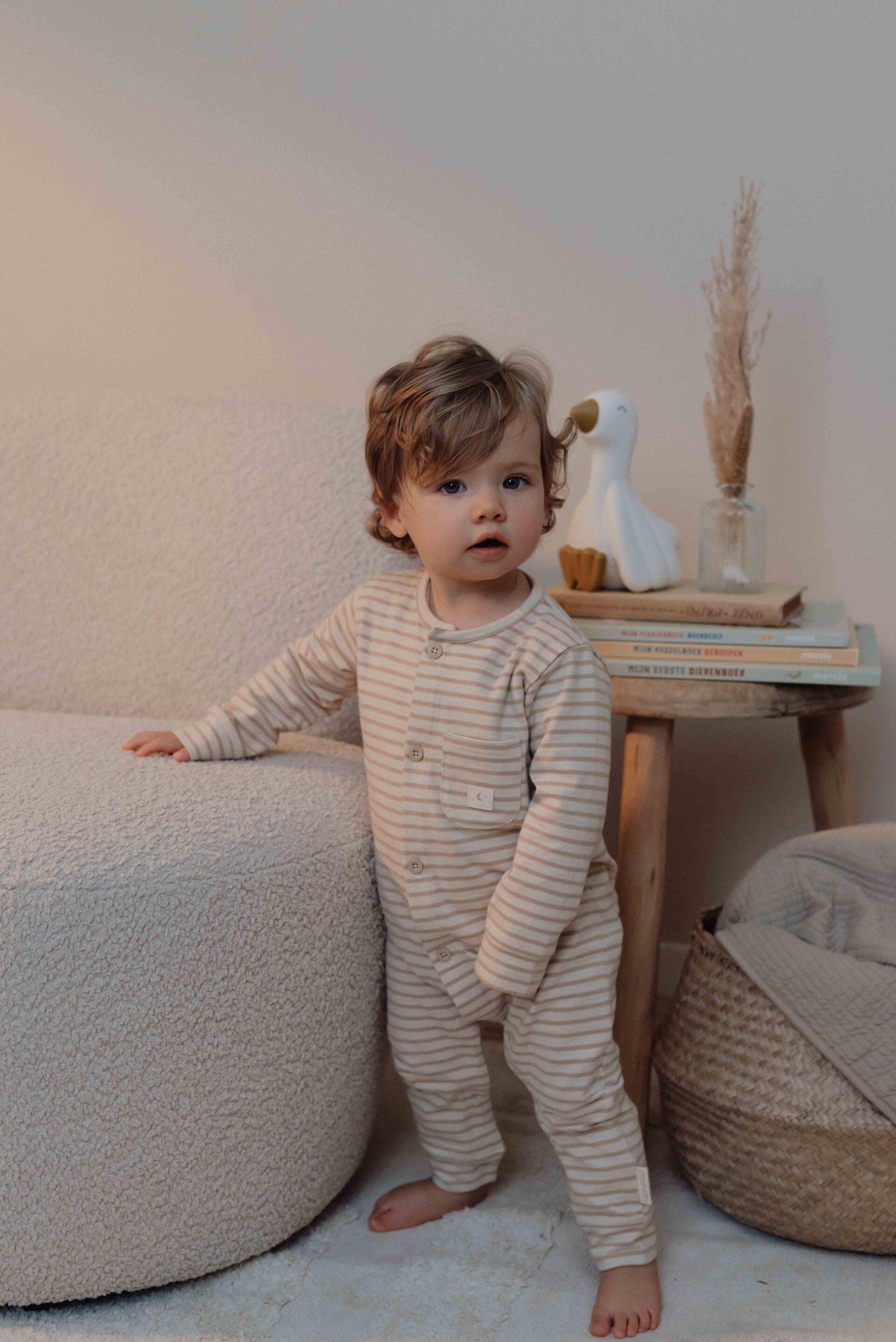 Snooze in streepjes: Dut heerlijk weg in deze zachte gestreepte pyjama's! Deze onesie heeft een klassiek ontwerp met witte en beige streepjes, en combineert comfort met stijl. De pyjama sluit met hout-look knopen aan de voorkant en drukknoopjes bij het kruis zodat het aan- en uitkleden en het verschonen van luiers heel gemakkelijk is. Gemaakt van biologisch katoen voelt deze pyjama zacht aan op de huid van je baby en staat het perfect bij het bijpassende beddengoed. Verpakt in een mooie doos, dus extra leuk om cadeau te geven. Verkrijgbaar in maten 50/56, 62/68 en 74/80.