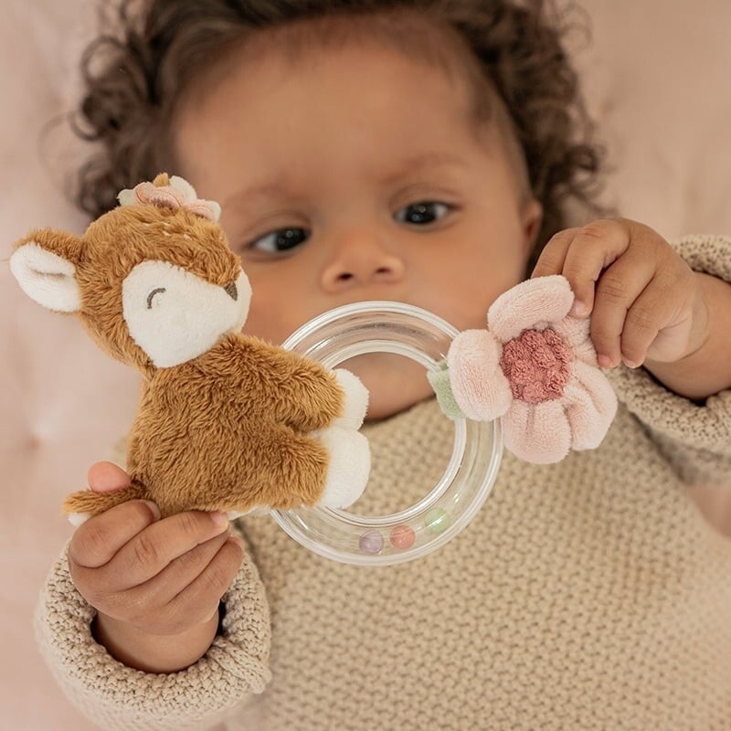 Grijp, draai en schud! Het lieve hertje met haar zachte vacht nodigt je uit om te spelen en deze ringrammelaar te laten horen. Het kleine bloemetje heeft ze speciaal voor jou geplukt om mee te kroelen. De transparante ring is gevuld met 3 kleine kraaltjes die rammelen als je kindje ermee speelt. Dit aantrekkelijke babyspeeltje prikkelt niet alleen je baby’s zintuigen en nieuwsgierigheid, maar bevordert ook de hand-oogcoördinatie.