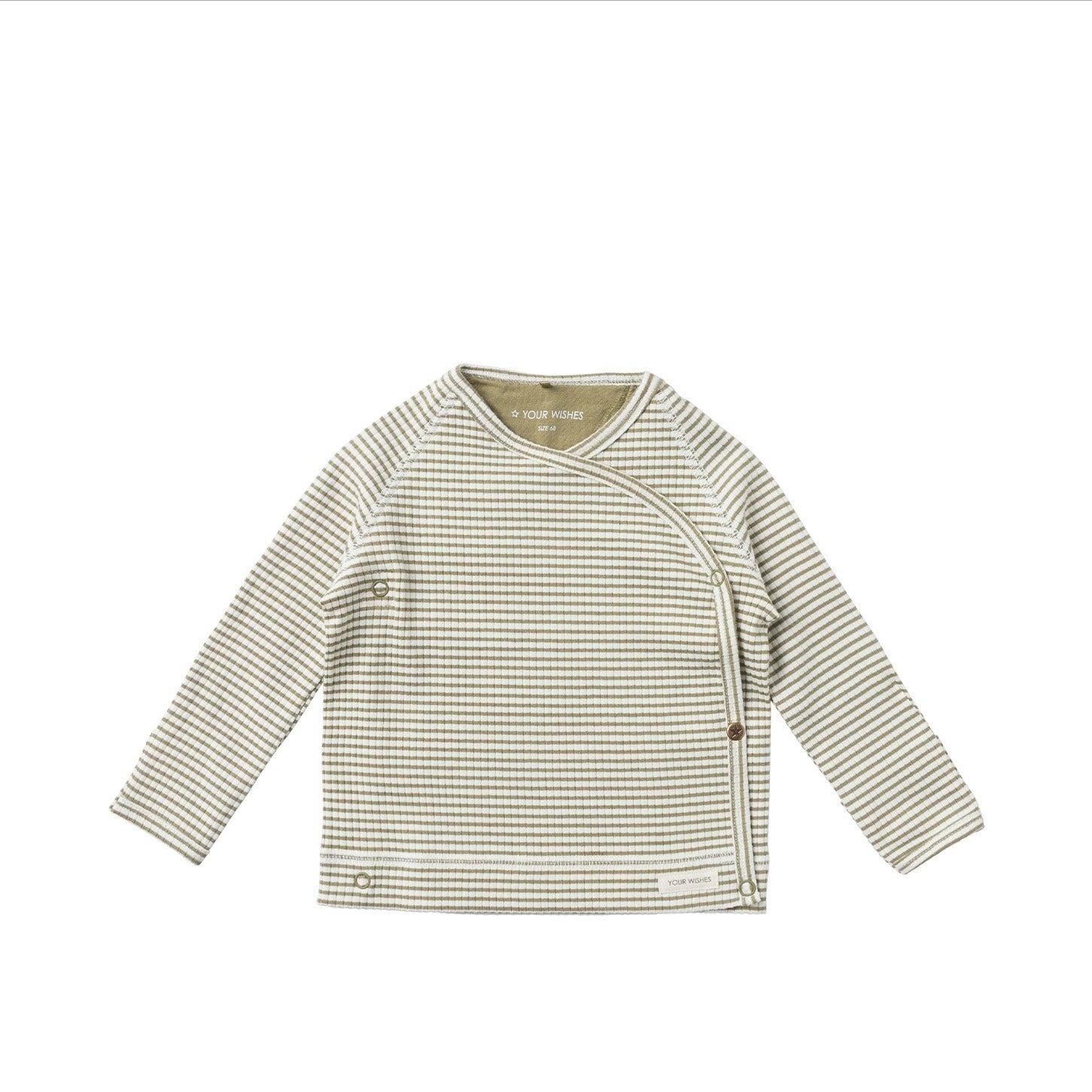 Met de Wrap Cuff Cardigan heeft jouw kleintje altijd een streepje voor! Dit overslag shirtje is verkrijgbaar vanaf maat 50 tot 74 en is uitgevoerd in een combinatie van katoen en elastaan, waardoor het goed rond het lichaam van jouw kindje aansluit. Het fijne aan een overslag shirtje is dat het niet over het hoofd heen aan- en uitgetrokken hoeft te worden. In dit geval leg je het gestreepte shirtje open en doe je de armpjes door de mouwen, om vervolgens de rechter flap over de buik te vouwen en vast te maken met de drukknopen. Vervolgens vouw je de linker flap over de buik en maak je ook die vast met de drukknopen! Wat ook heel fijn is aan dit gestreepte overslag shirtje is dat het ingebouwde handschoentjes heeft. Hierdoor kan jouw kleintje zich niet per ongeluk openkrabben en blijven de handjes lekker warm!