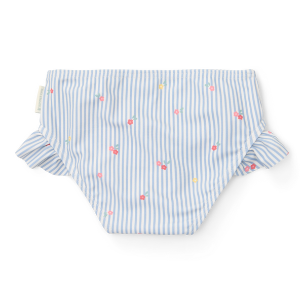 Een golf van plezier! Plons en spring over elke golf, het zwembroekje blijft de hele dag lekker zitten. Ontworpen met speelse details om elke stranddag of zwembadavontuur extra speciaal te maken. Dit bikinibroekje heeft fijne blauwe en witte streepjes, versierd met kleine rozen bloemetjes. De elegante ruches aan de zijkanten benadrukken de romantische en verfijnde stijl. Verkrijgbaar in de maten 62/68, 74/80, 86/92 en 98/104. Combineer met het bijpassende zwemshirt en zonnehoedje en ga voor Ocean Blue van top tot teen. Vergeet niet altijd zonnebrandcrème te gebruiken om je kleintje te beschermen.