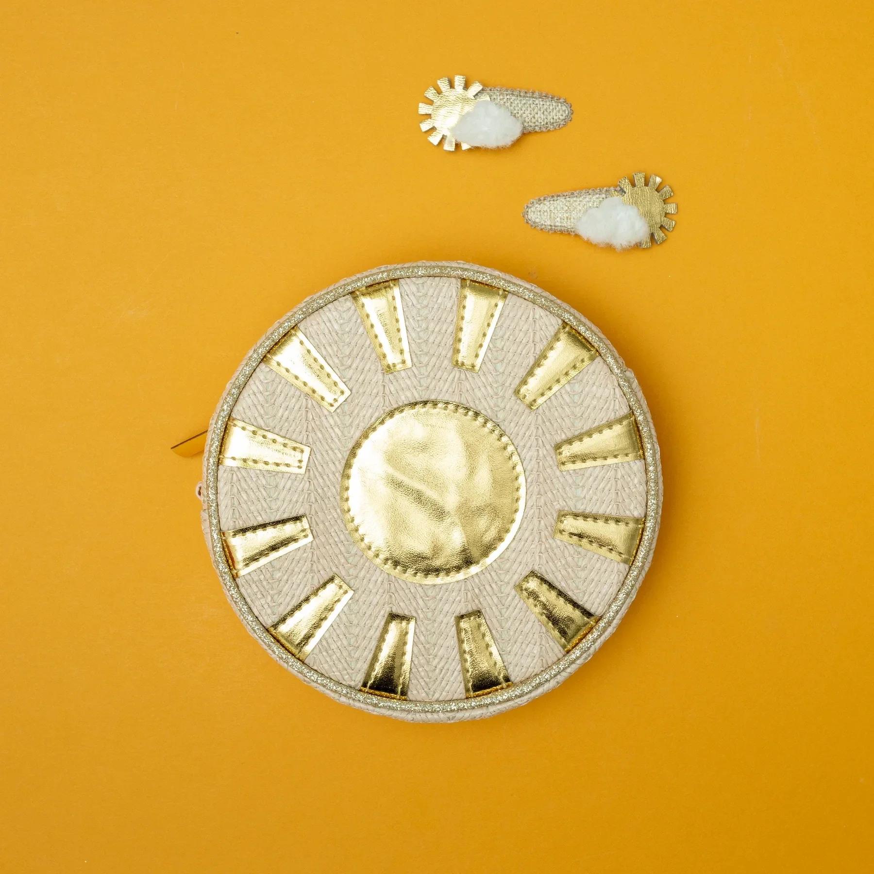 3D-ronde tas gemaakt van geweven raffia-stof met een glanzende, goudkleurige metallic zonnestraal