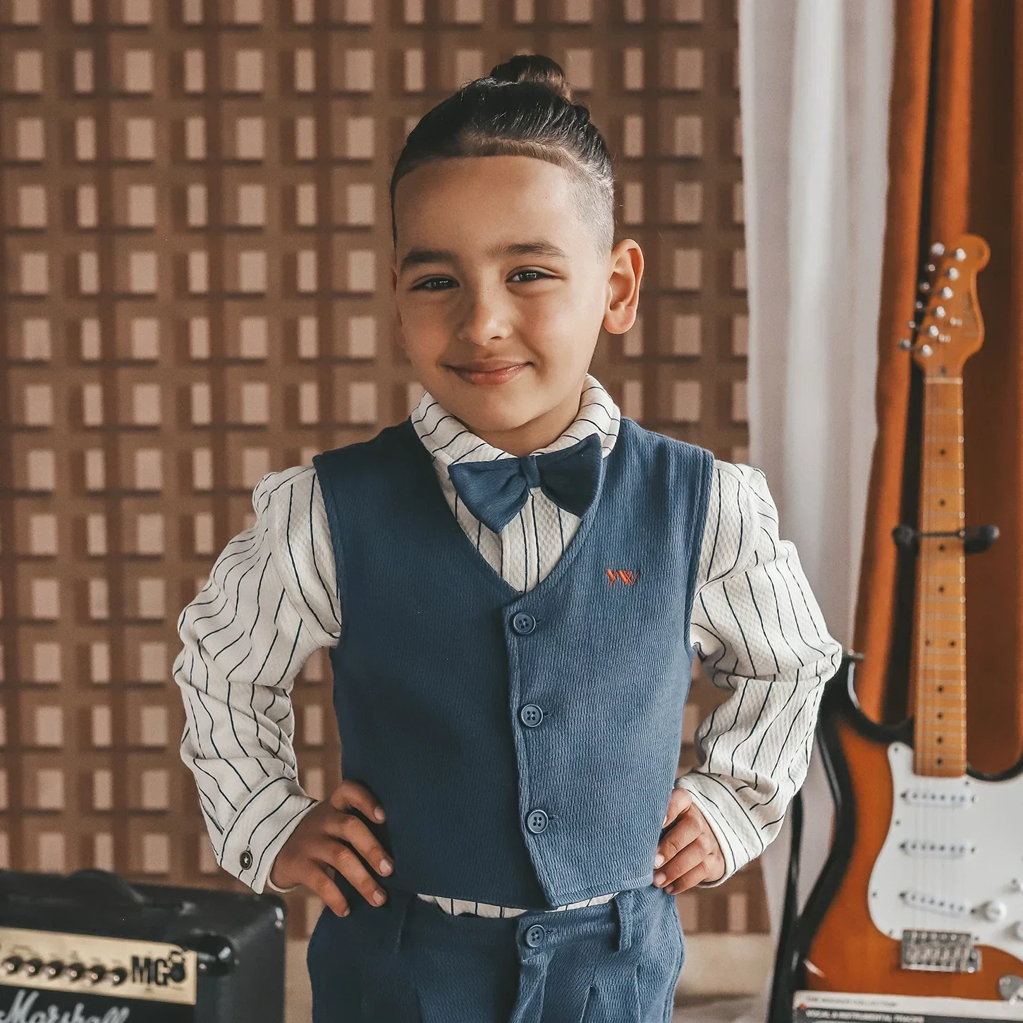 Met het Relaxed Shirt maak je elke outfit compleet! Dit zachte shirt, verkrijgbaar van maat 80 tot 104, is gemaakt van een rekbare stof met een subtiel donkerblauw streepje. Het heeft een nette kraag, een borstzak en sluit met mooie antiek bronzen knoopjes aan de voorkant.