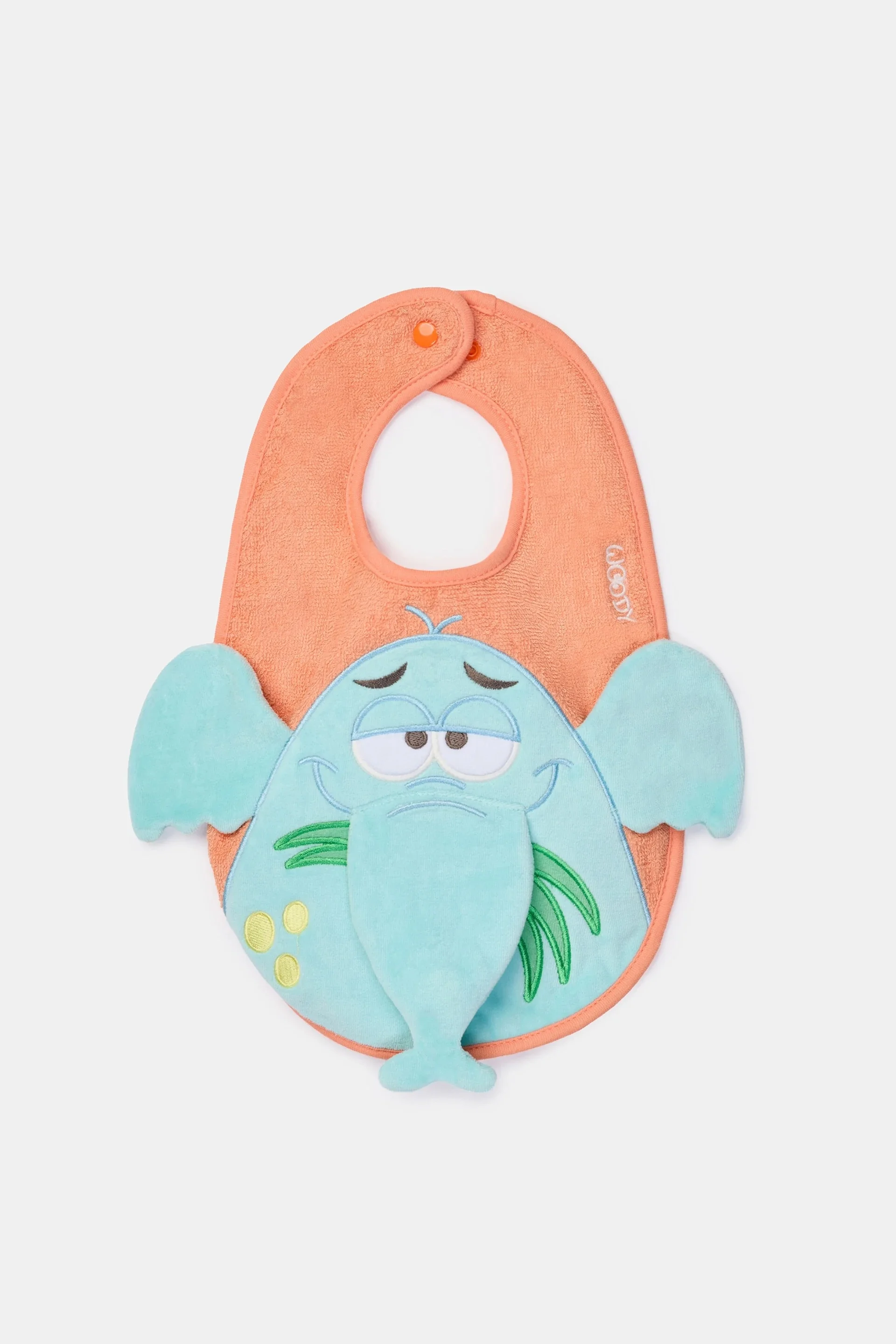 Roze slabbetje met een grote olifanten print op geborduurd. Deze slab sluit achteraan met 2 drukknopen (2 verschillende standen mogelijk). Dit wordt zeker en vast de favoriet door het geluidseffect!