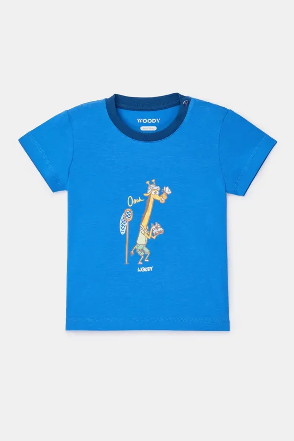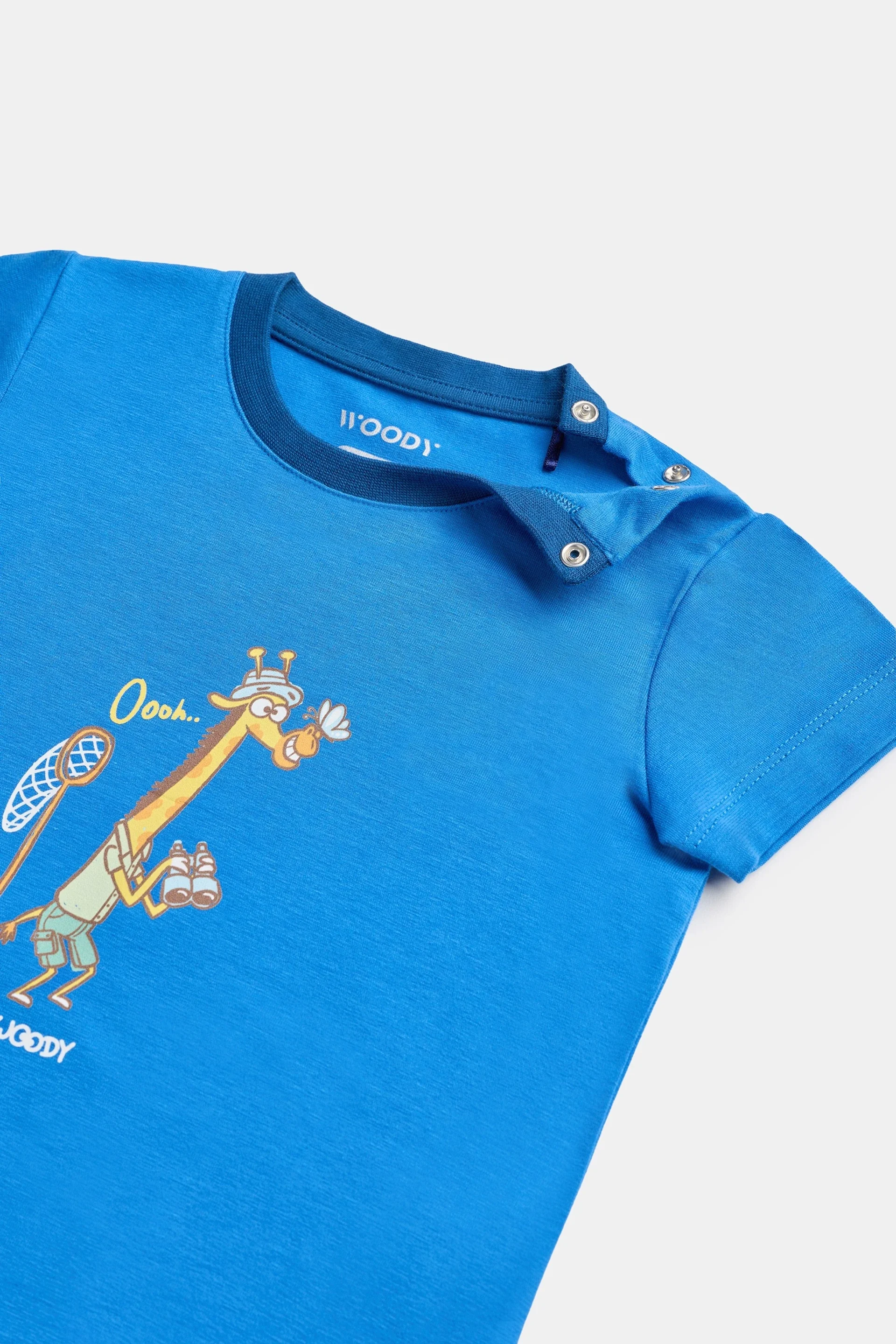 Jongens en heren pyjama van soepel katoen. Het effen blauwe bovenstuk valt op door de grote vrolijke glow-in-the-dark dierenprint. Het bovenstuk wordt gecombineerd met een effen blauwe short.