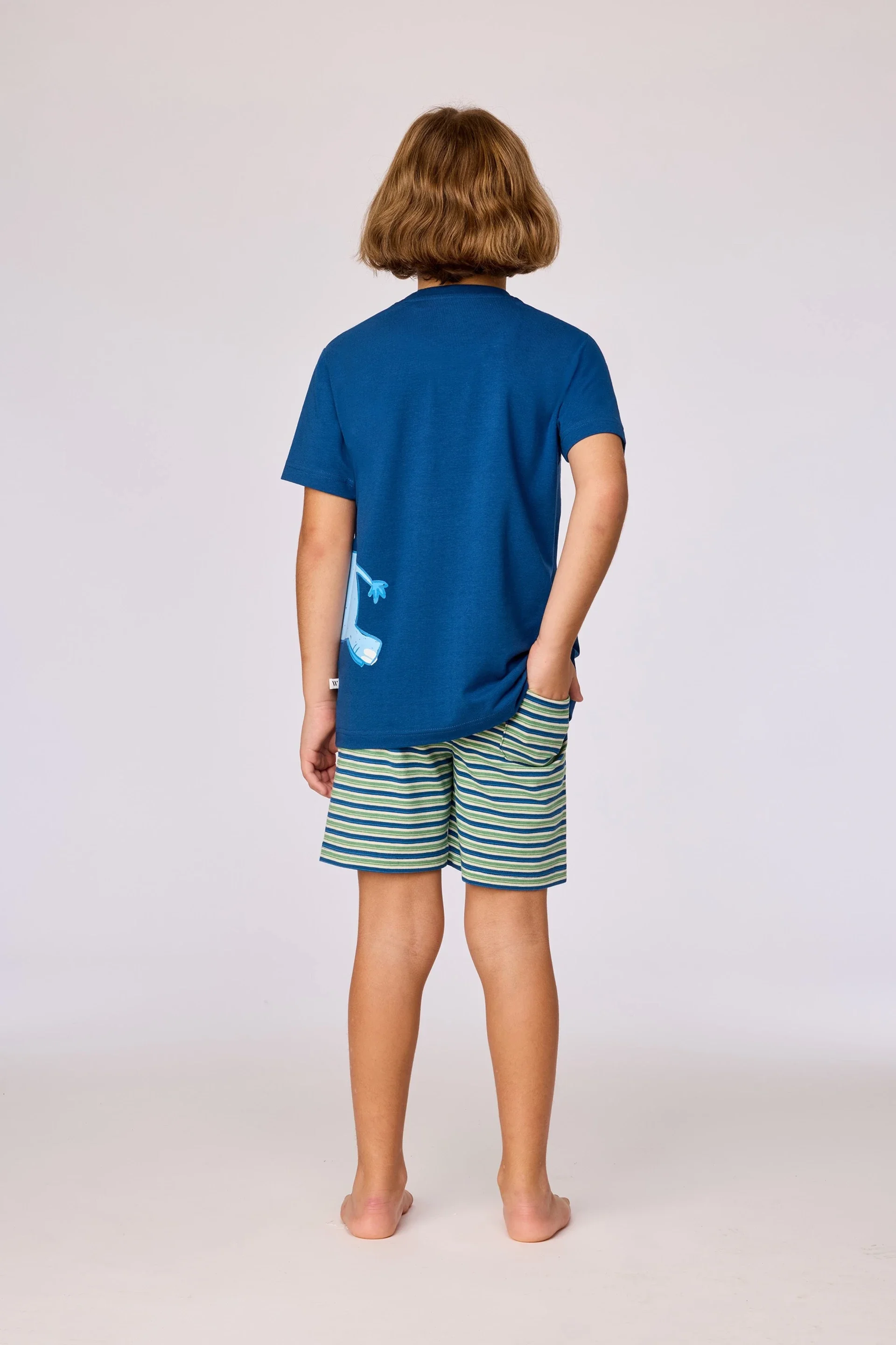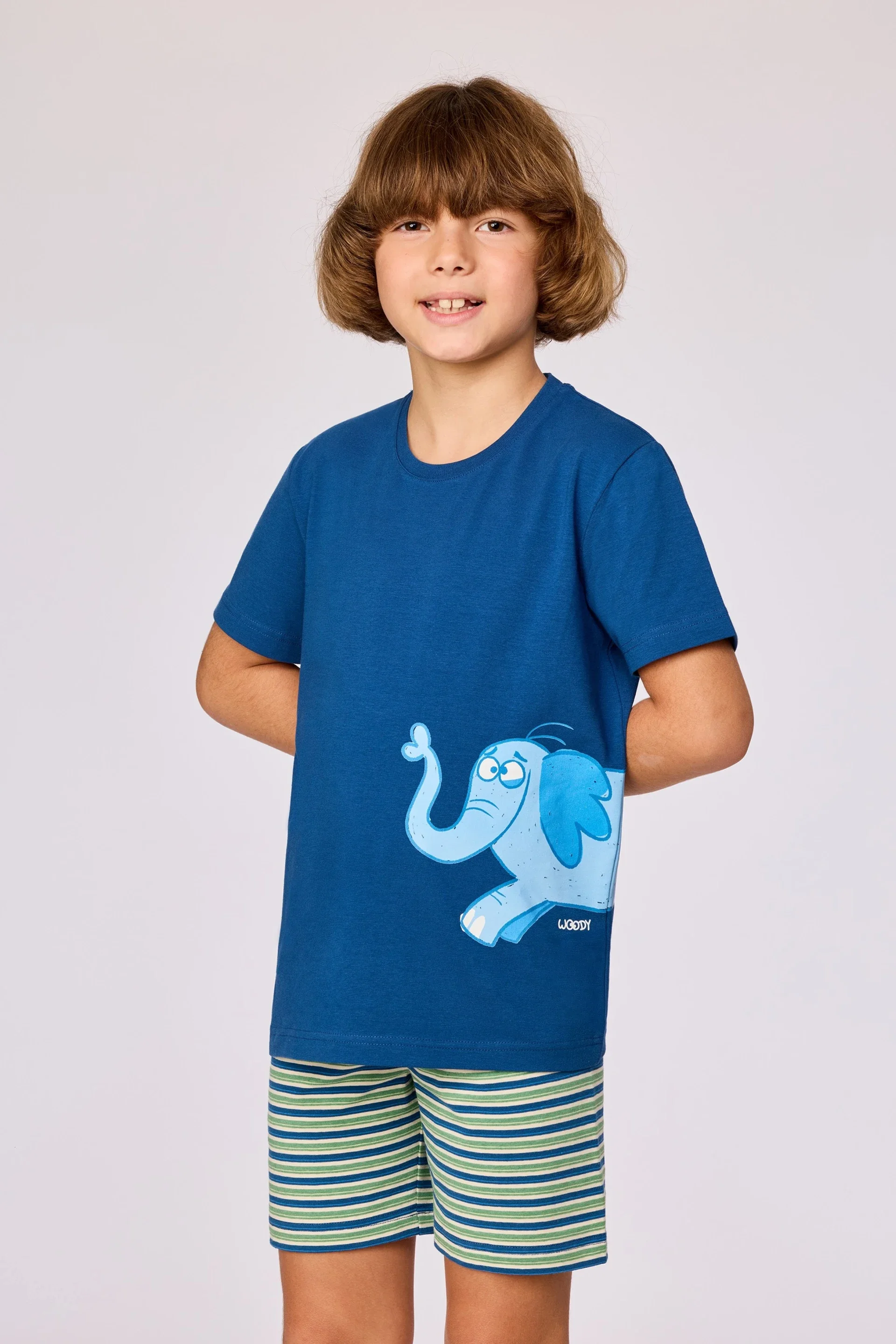 Jongens pyjama van soepel katoen. Het effen blauwe bovenstuk valt op door de grote vrolijke olifantprint. Het bovenstuk wordt gecombineerd met een kleurrijk gestreepte short.
