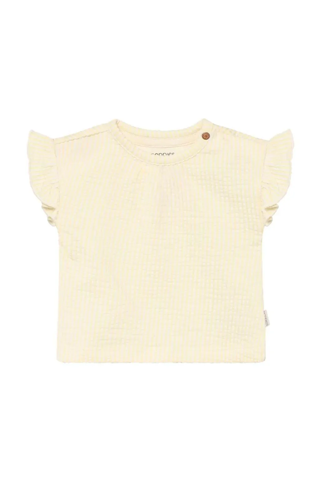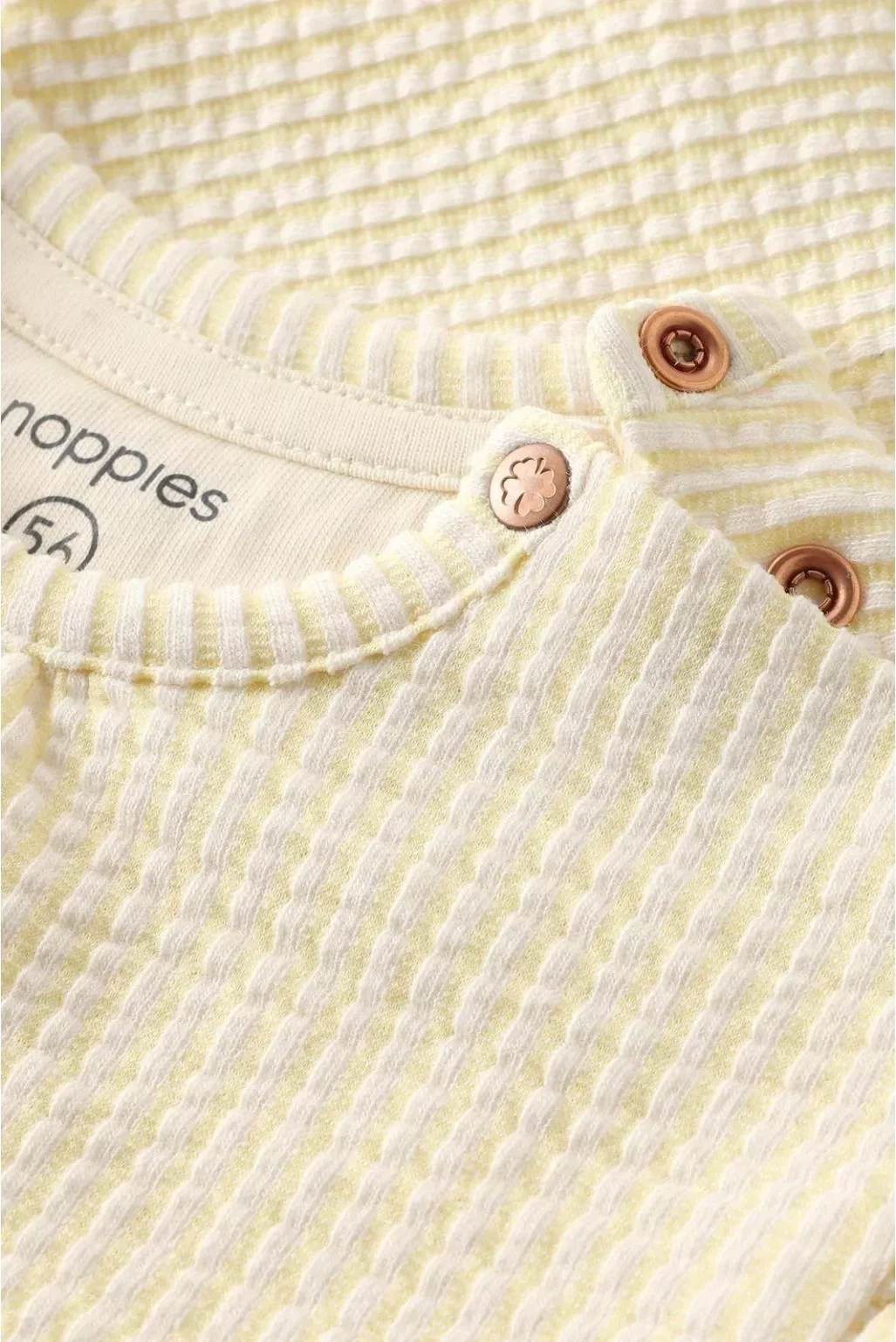 Dit meisjes topje van Noppies is een frisse toevoeging aan haar zomergarderobe. De luchtige seersucker streepjesstof geeft het item een speelse uitstraling. De cap sleeves en ronde hals geven het topje een klassiek silhouet met een zachte touch. Op de rug zorgen de drukknoopjes ervoor dat je het topje makkelijk aan- en uitdoet, ideaal voor beweeglijke kleintjes en snelle momenten tussendoor. Dankzij de lichte stretch en het ademende karakter van de stof is dit topje perfect voor warme dagen. Of ze nu speelt in de tuin of een uitstapje maakt – ze zit altijd goed. Een zomerse favoriet waarin comfort en stijl samenkomen. Voeg dit streeptopje vandaag nog toe aan haar garderobe!