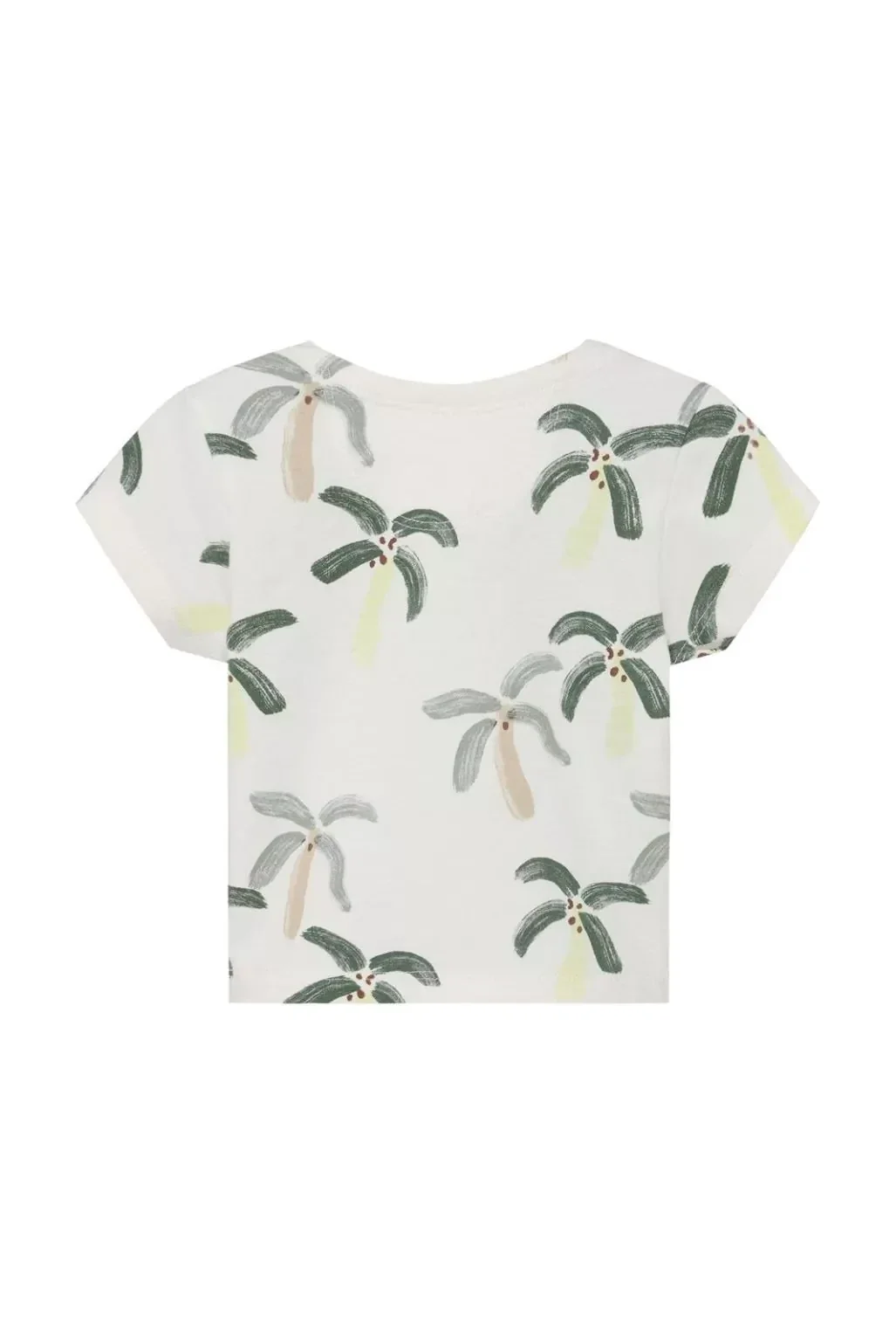 Tropisch tintje voor je kleintje? Dit T-shirt van Noppies Baby is versierd met een all-over palmbomenprint. Perfect voor zonnige dagen waarop je kindje straalt in een vrolijke outfit. Het shirt is gemaakt van zachte single jersey van biologisch katoen met een beetje stretch. Daardoor zit het comfortabel en beweegt het moeiteloos mee. Dankzij de knoopsluiting op de schouder trek je het shirt makkelijk aan en uit. De ronde hals en korte mouwen maken dit shirt luchtig en geschikt voor zomerse temperaturen. Combineer het met een shortje of luchtige broek voor een complete look die er niet alleen leuk uitziet, maar ook lekker zit. Dit item is GOTS-gecertificeerd (CERES-0366), wat betekent dat het op verantwoorde en milieuvriendelijke wijze is geproduceerd. Zo kies je bewust én stijlvol tegelijk.