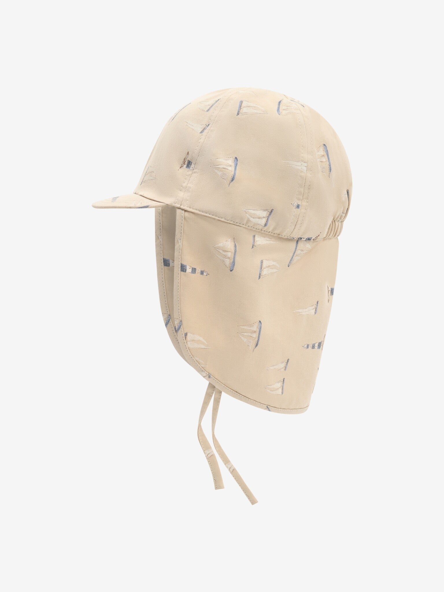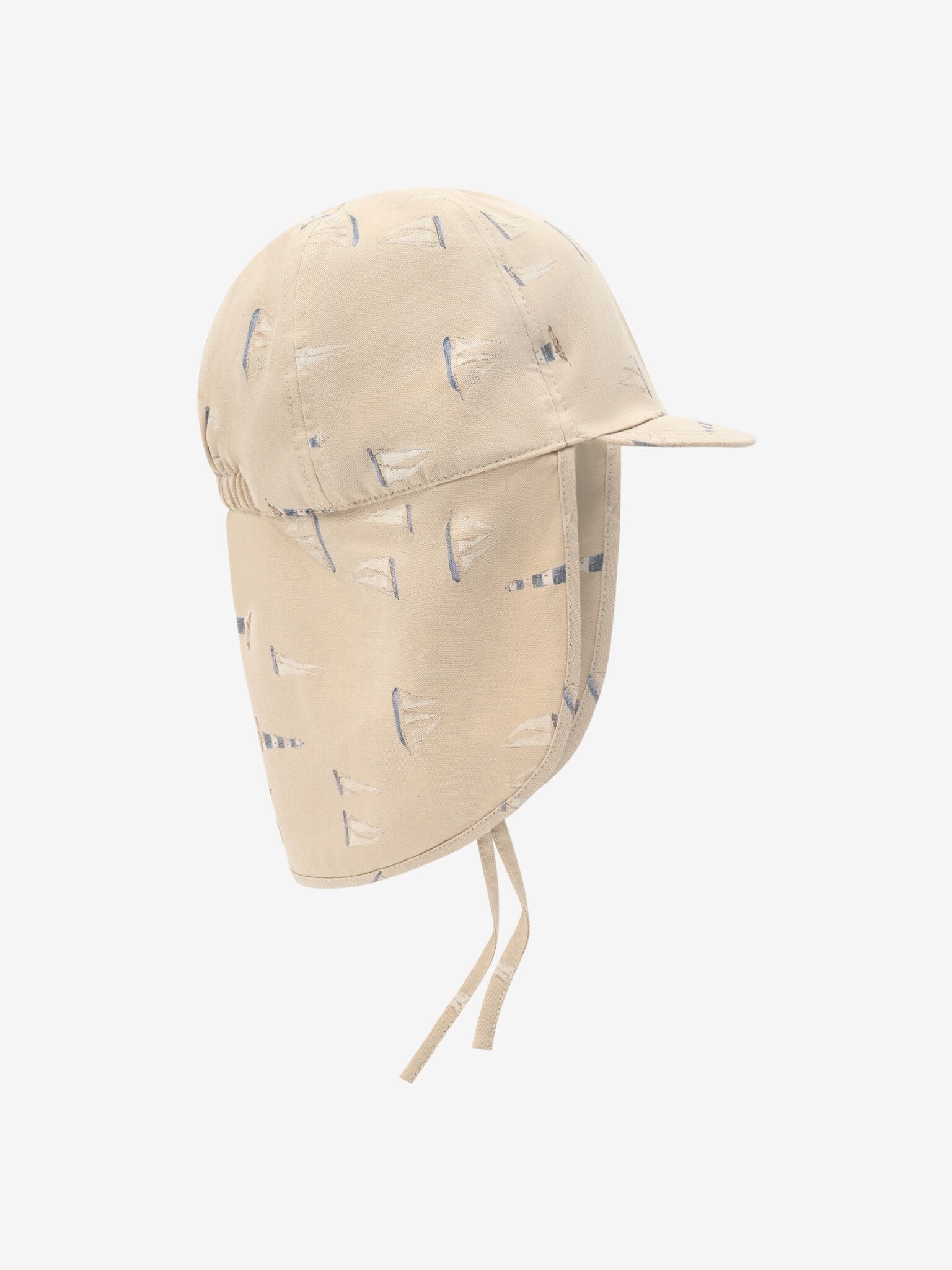 Een coole zomerhoed met een praktische clep en een lange kap aan de achterkant. Elastiek aan de achterkant van het hoofd en koordjes onder de kin zorgen ervoor dat de hoed goed op het hoofdje van het kind past. Hij biedt schaduw voor zowel gezicht als nek. De zonnehoed is gemaakt van 100% katoen. Getest en gecertificeerd volgens UPF 30.