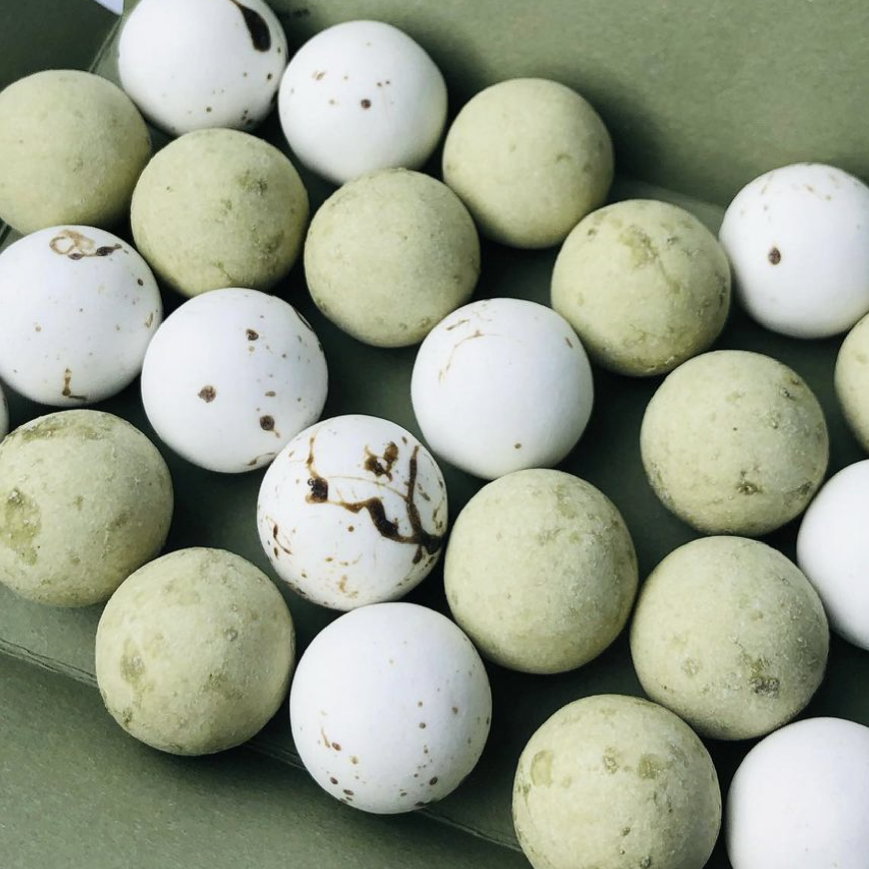 Deze marbles hebben een mat suikerlaagje aan de buitenzijde en zijn gevuld met een praliné hazelnoot chocopaste en smelten weg in je mond.